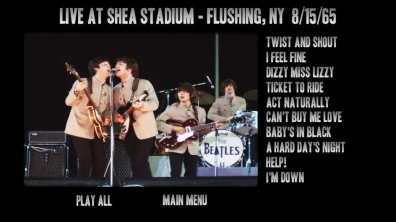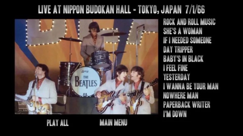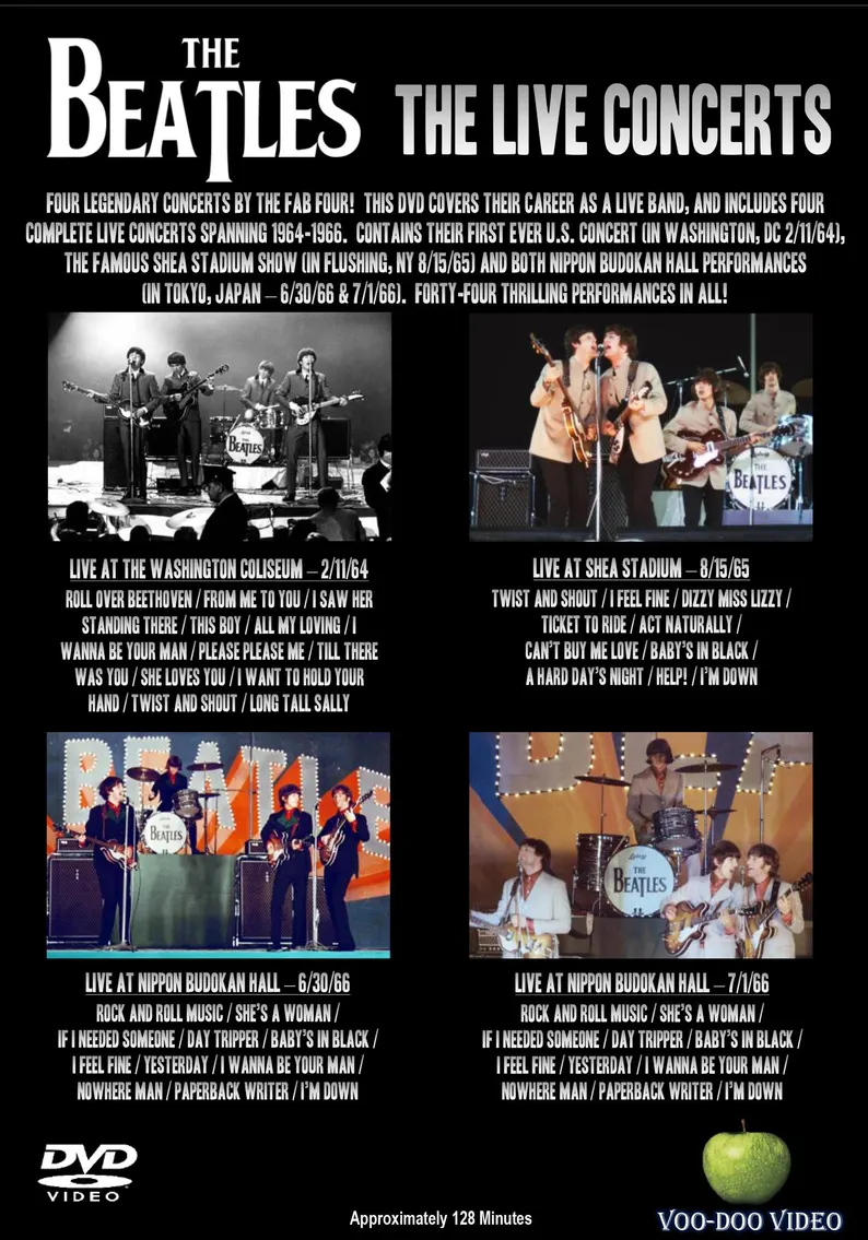 Fantastic 2018 fan-made collection includes four complete Beatles concert videos in the best quality (picture and sound) available. Over two hours of Beatle-bliss!! Includes their first U.S. concert (Washington, DC 2/11/64), the famous Shea Stadium concert (8/15/65), and two shows from the Nippon Budokan Hall in Tokyo, Japan (6/30 + 7/1/66). Has fully interactive menus, so finding that favorite song is a breeze! Fantastic quality, both in
