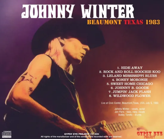 Experience a rare 1983 live recording from the guitar legend, professionally captured via pristine stereo soundboard in his home state of Texas. This complete show from July 9 in Beaumont features a dynamic setlist ranging from his 1969 debut tracks to traditional covers like “Wildwood Flower.” A high-fidelity essential capturing Johnny Winter at his peak in the 80s.