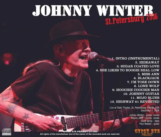 A rare, newly unearthed soundboard live recording of legendary guitarist Johnny Winter is now available! This performance, held on December 7, 2006, at the State Theatre in St. Petersburg, Florida, USA, is captured in perfect stereo soundboard quality. The first two minutes are missing from the soundboard source, so we’ve seamlessly patched in top-quality audience recording to complete the full live performance. This is a previously unreleased, newly discovered live recording!