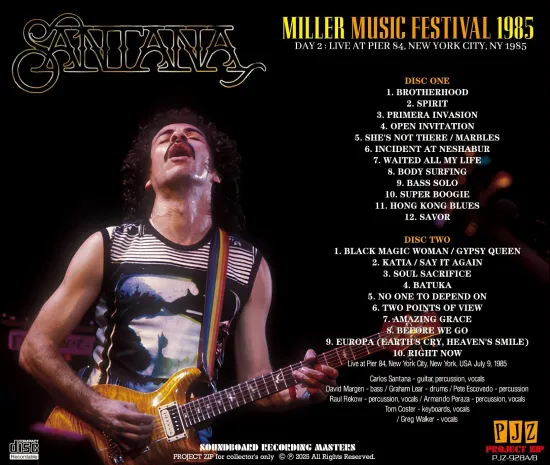 This release captures Santana’s performance at the outdoor “Miller Music Festival” in New York on July 9, 1985, using a previously unreleased soundboard recording leaked by a source involved. The nearly complete, top-quality soundboard recording captures the entire approximately two-and-a-half-hour set (only “Breaking Out” is missing). At the time, Santana had just released their first album in three years, Beyond Appearance. This is a precious, newly unearthed live recording from Santana’s 1985 era, a time when the band had refreshed its lineup, resumed live activities, and would soon appear at the legendary Live Aid concert!